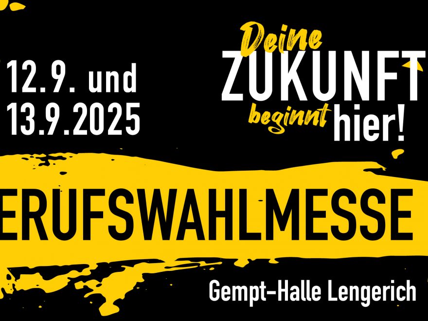Vom 12. bis 13.09.2025 findet in der Gempt-Halle in Lengerich die Berufswahlmesse statt. Wir sind dabei und freuen uns auf dich! Du kannst uns am Stand Nr. 58 finden.